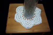 A doily (also doiley, doilie, doyly, or doyley) is an ornamental mat, typically made of paper or fabric, and variously used for protecting surfaces or binding flowers, in food service presentation, or as a clothing ornamentation, as well as a head covering for Jewish women and Christian women. It is characterized by openwork, which allows the surface of the underlying object to show through.