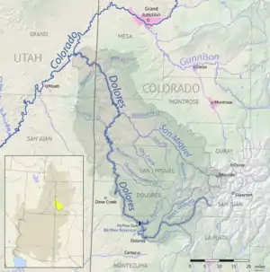 The Dolores River is a tributary of the Colorado River, approximately 241 miles (388 km) long,[2] in the U.S. states of Colorado and Utah. The river drains a rugged and arid region of the Colorado Plateau west of the San Juan Mountains. Its name derives from the Spanish El Rio de Nuestra Señora de Dolores, River of Our Lady of Sorrows. The river was explored and possibly named by Juan Maria Antonio Rivera during a 1765 expedition from Santa Fe.