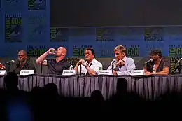 In 2010, Lundgren made a guest star appearance on the TV series Chuck in the fourth-season premiere episode, "Chuck Versus the Anniversary", as Russian spy Marco, with references to Rocky IV's Ivan Drago.[113] He then played a drug-addled assassin in the ensemble action film The Expendables, in a cast which includes popular action stars such as Stallone, Jason Statham, Jet Li and Randy Couture as an group of elite mercenaries, tasked with a mission to overthrow a Latin American dictator. It was described by Lundgren as "an old-school, kick-ass action movie where people are fighting with knives and shooting at each other."[114] The film received mixed reviews from critics but was very successful commercially, opening at number one at the box office in the United States, the United Kingdom,[115] China[116] and India.[117]