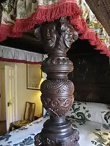 Silk and metallic thread were woven in Scotland to make passementerie trimmings and fringes for upholstery and bed curtains. Colin Campbell of Glenorchy (died 1640) employed a silk weaver from Antwerp, Nicolas Herman, who had set up his workshop in Perth, to make passementerie for his beds at Balloch.[70] An inventory was made of Herman's own furnishings, his stock of trimmings and thread, and tools used by five employees in his Perth workshop.[71] An Edinburgh furniture maker, Walter Denniestone, had a "painted bed" in his workshop when he died in 1631. Another Edinburgh wright, Jeromie Young, was making two "wainscot beddis, the ane carvit, and the uthir not carvit" in 1645.[72]