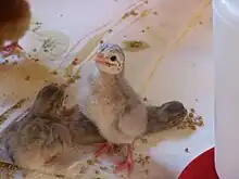 They lay 25โ€“30 eggs in a deep, tapering nest. Their eggs are small, dark and extremely thick-shelled. The hens have a habit of hiding their nests, and sharing it with other hens until large numbers of eggs have accumulated. The incubation period is 26โ€“28 days, and the chicks are called "keets". As keets, they are highly susceptible to dampness (they are indigenous to the more arid regions of Africa) and can die from following the mother through dewy grass. After their first two to six weeks of growth, though, they can be some of the hardiest domestic land fowl.