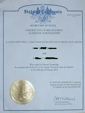 - ↑ "Domestic Partners Registry - California Secretary of State". Ss.ca.gov. 2013-06-26. Archived from the original on 2008-07-19. Retrieved 2013-12-03.