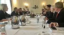 However, in 2018, after it was revealed by a woman that a 'groping' incident occurred in 2000, Trudeau said there was no need to conduct an investigation into the allegation.[65] In March 2019, Liberal MP Celina Caesar-Chavannes resigned as a member of the Liberal caucus, citing that Trudeau shouted at her on the phone when she told him she would not like to run in the 2019 federal election. Caesar-Chavannes told The Globe and Mail that Trudeau shouted that she didn't appreciate him. As a result of this resignation, and the resignation of other prominent female liberal members of parliament Jody Wilson-Raybould and Jane Philpott (who resigned from cabinet, but not from caucus following the SNC-Lavalin affair), opposition MPs, such as Candice Bergen, have accused Trudeau of being a "fake feminist".[66][67][68] In the April 2019 Daughters of the Vote event organized by Equal Voice Canada in the House of Commons, many of its delegates turned their backs when Trudeau spoke as a protest for his actions in the SNC-Lavalin Affair.[69]