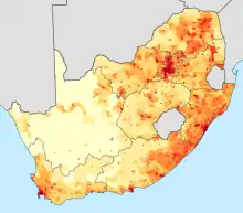 In 2012 South Africa was called the "rape capital of the world" when less than 1% of rapes that occur are reported to the police.[1] The South African Medical Research Council did an electronic anonymous survey, interviewing just over 1,700 men, that found that one in four males had raped; 73% of those men surveyed had raped before the age of 20.[11] Within rural South Africa there is a higher rate of HIV between partners. In Limpopo, a team of researches traveled to rural villages to implement a three-part trial to test if intervention within relationships that had domestic violence and/ or HIV prevalence in the home. The homes where the researchers just assisted with the problems of domestic violence were able to reduce the prevalence by 55%, but did not effect those who had unprotected sexual intercourse with a non-spousal partner. Although the rate of domestic violence within these small villages did get reduced; the rate of those having unprotected intercourse after being exposed, and diagnosed with HIV, did not go down. According to reports by the U.N., South Africa has one of the highest rates of HIV/AIDS in the world.[12]