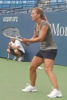 At the Canadian Open, she lost in the second round to Alizé Cornet.[71] In Cincinnati at the Western & Southern Open, Cibulková was defeated in the first round by Flavia Pennetta.[72] At the Connecticut Open, she lost in her quarterfinal match to fourth seed and eventual finalist, Lucie Šafářová.[73] In New York at the US Open, Cibulková stunned seventh seed and former world No. 1, Ana Ivanovic, in the first round.[74] She was defeated in the third round by 25th seed Eugenie Bouchard.[75]