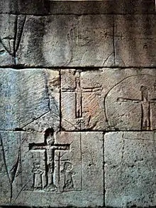 In 1307, many Knights Templar were imprisoned in Domme during the trial against them, of which hundreds of Templar graffiti still bear witness. They used a code system involving series of geometric figures: the octagon represented the Grail, the triangle surmounted by a cross represented Golgatha, the square represented the Temple, and the circle represented the imprisonment. Similar inscriptions (of disputed authenticity) have been found in other towns such as Loches, Gisors, and Chinon.