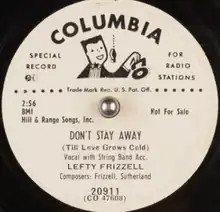"Don't Stay Away (Till Love Grows Cold)" is a song written by Lefty Frizzell and Loys Sutherland, sung by Frizzell, and released on the Columbia label (catalog no. 20911). In April 1952, it peaked at No. 2 on Billboard's country and western best seller and juke box charts.[1] It spent 12 weeks on the charts and was also ranked No. 17 on Billboard's 1952 year-end country and western juke box chart and No. 19 on the year-end best seller chart.[2]