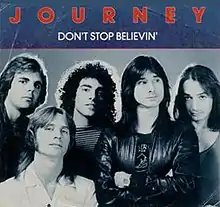 "Don't Stop Believin'" is a rock song by American band Journey. It was released in October 1981 as the second single from the group's seventh studio album, Escape (1981), released through Columbia Records. "Don't Stop Believin'" shares writing credits between the band's vocalist Steve Perry, guitarist Neal Schon, and keyboardist Jonathan Cain. A mid-tempo rock anthem and power ballad,[2] "Don't Stop Believin'" is memorable for its distinctive opening piano riff.