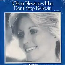 "Don't Stop Believin'" is the title track from the 1976 album by Olivia Newton-John. Written and composed specifically for Newton-John by John Farrar. It was released in August 1976 as the album's lead single. It peaked at number thirty-three on the Billboard Hot 100. It was her seventh number one on the Easy Listening chart, spending one week at the top of the chart in September 1976.[1] The single also went to number fourteen on the country chart.[2]