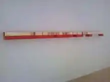 • Untitled, held by the Indianapolis Museum of Art, was created in 1967. It consists of a brass bar over a series of five steel boxes in Judd's signature cadmium red.[12] The long brass bar is both hollow and open at both ends. The red boxes increase geometrically in size from right to left, with the fifth box being sixteen times the length of the first. Conversely, the voids between the boxes decrease geometrically, the leftmost space being one quarter the size of the rightmost. The actual fabrication was performed by the Bernstein Brothers firm.[13][4]