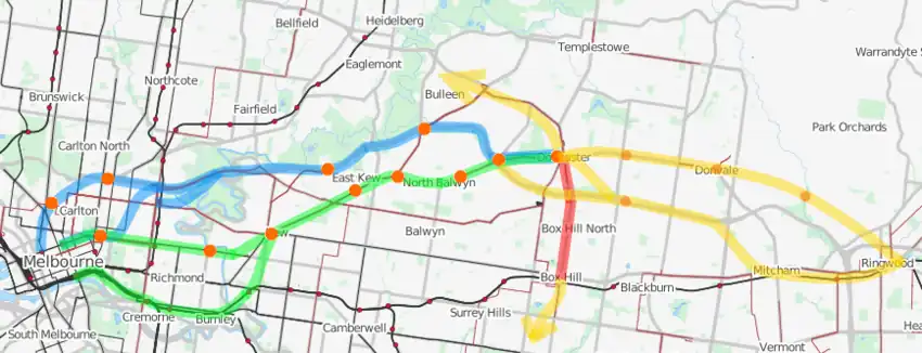 - Orbital Network: “South to Box Hill” - a connection from Box Hill railway station; now proposed as part of a future northern section of the Suburban Rail Loop