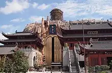 In the back of the courtyard lies, the main building of the temple, the Hall of Guanyin. The hall's exterior mimics a large red natural cliff. The entrance gate to the building is about 20 meters high and 10 meters wide. Its bronze doors are decorated with 999 relief images of Buddha.[2] The hall is 31 meters wide, 42 meters deep, and 31 meters high[2] and houses a gilded statue of the thousand-armed Guanyin. The statue is 27 meters tall and stands on a 2-meter-high lotus base.[2] Its arms are up to 5 meters in length.[2]