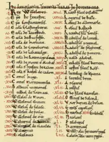 The manuscripts do not carry a formal title. The work is referred to internally as a descriptio (enrolling), and in other early administrative contexts as the king's brevia ((short) writings). From about 1100, references appear to the liber (book) or carta (charter) of Winchester, its usual place of custody; and from the mid-12th to early 13th centuries, to the Winchester or king's rotulus (roll).[17][18]