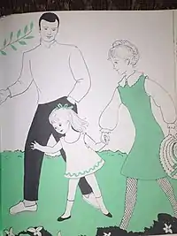 In 1948, Longmans, Green & Co. published new editions of books in a nineteenth-century series known as Lang's Fairy Books. The company called upon Gregory to illustrate the Green Fairy Book and the Violet Fairy Book.[48][49][50] In Green Fairy Book, for Lang's version of The Glass Coffin by the Brothers Grimm, Gregory showed the moment when the female protagonist attempts to shoot her adversary with a pistol. The text accompanying the illustration says, "I flew into such a rage that I drew a pistol and fired at him, but the bullet rebounded from his breast and struck my horse in the forehead." This illustration is shown above, Image No. 12. Her last illustration assignment was for a publisher called Behavioral Publications in a series called "Children's Series on Psychologically Relevant Themes". The book, All Alone with Daddy (by Joan Fassler, Behavioral Publications, New York, 1969) is about a day that preschool-age Ellen spends with her father while her mother is out of town.[51] Reviewers criticized the depiction of the mother as stereotypically focused on homemaking, cosmetics, and clothes, but approved the way the father was shown to accept household responsibilities.[52][53] One of Gregory's illustrations shows the happily reunited family of three. This illustration is shown above, Image No. 13.