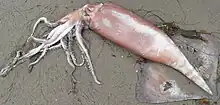A Humboldt squid that washed up on a Santa Barbara shoreline
