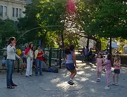 Double Dutch is a game in which two long jump ropes turning in opposite directions are jumped by one or more players jumping simultaneously. It is believed to have originated among Dutch immigrants in New York City, although it has been a popular school playground game for much longer than that in the Netherlands, and is now popular worldwide.[1] While it had long been a popular street activity for African American girls in New York City,[2] the modern sport of Double Dutch originated in the early 1970s with NYPD officers Ulysses Williams and David Walker, who formalized the rules for competition. The first official competition was held in 1974. Competitions in Double Dutch range from block parties to the world level. During the spring of 2009, Double Dutch became a varsity sport in New York City public high schools.[3]