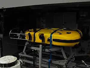 The ROV's payload can consist of scanning sonar, echo locations, doppler logs, or self-navigation systems.[2] All Double Eagles are equipped with an extendable manipulator arm, which is commonly used to place a small explosive charge on a mine.[1] The ROV can be modified to double as a self-propelled variable depth sonar: the Mark II Double Eagles fitted to the French Navy's Tripartite-class minehunters have been altered to carry a Thales TSM 2022 sonar, while a similar upgrade is to occur to the Mark III units being acquired for the Tripartites of the Royal Netherlands Navy.[2]