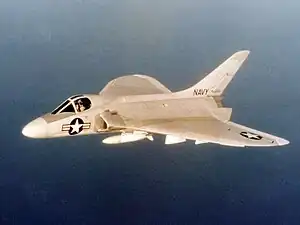 As the design was refined, it was decided to substantially reduce the wing's thickness to increase its high speed capabilities.[7] The twin J34 engine arrangement was also swapped out for a single Westinghouse J40 engine. Only a single hydraulic system was incorporated, thus measures to permit manual reversion in the event of hydraulic failure were also included.[8] Rockets also became the primary armament, which were housed in pylon-mounted pods underneath the wing. A formal operational requirement was issued by the Navy in 1948, however, according to aviation author Tommy H. Thomason, it was an apparently foregone conclusion that the contract would be awarded to Douglas from the onset.[8] Specifics of this requirement included the ability to intercept and destroy an enemy aircraft at an altitude of 50,000 ft (15,240 m) within five minutes of the alarm being sounded.[9] At the time, Navy planners were particularly concerned by the threat posed to its carrier battle groups by high altitude Soviet bomber aircraft; furthermore, as early jet aircraft were fuel hungry and had limited endurance, to maximise an interceptor aircraft time on station it was particularly desirable for such an aircraft to possess a relatively high rate of climb so that it could be launched and rapidly reach its operational altitude.[10]