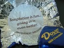 Dove produces a wide range of chocolates including milk chocolate, dark chocolate, caramel, fruits, nuts, Minstrels, Ripple (milk chocolate with a folded or "rippled" milk chocolate center), Amicelli, Duetto, Promises, Bubbles, and Truffle. Related brands in other parts of the world include "Jewels", and "Senzi" in the Middle East. Dove also produces other chocolate products including ready-to-drink chocolate milk, hot chocolate powder, chocolate cakes, ice cream and more. Dove is known for the messages written on the inside of the foil wrapper of each individual chocolate piece.[4]