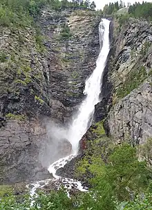 An unequaled natural attraction in Norway is the 156-metre (512 ft) high waterfall down in Åmotan (62°30′36.14″N 9°03′32.26″E / 62.5100389°N 9.0589611°E).[3] It is located at along Road 70 between Oppdal and Sunndalsøra at the northern border of Åmotan-Grøvudalen Landscape Protected Area, on the northern edge of Dovrefjell–Sunndalsfjella National Park.[4]