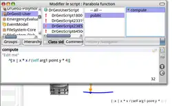 Dr. Geo is shipped with its source code and the developer tools. Therefore its code can be edited and recompiled from Dr. Geo while it is functioning. This design, inherited from Pharo, makes easy to test new ideas and new designs.