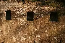 Man-made chambers have been hewn out of a rock massif opposite the castle, the so-called Buchkammerfels, which lies on the Heidenberg, 420 metres (1,380 ft) high. The date and function of these Heidenkammern are unknown: it is speculated it may have been an outpost of the Drachenfels.