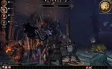 During gameplay, the player encounters a variety of enemies, including giant spiders, Darkspawn, ghosts, walking trees, and dragons.[8] They also recruit companions, who accompany them and provide assistance in battle. These companions are normally controlled by artificial intelligence, with behaviour that the player can adjust through the "Tactics" menu, but the player also has the option to switch between characters and is able to issue orders to them in real-time or pause the game to queue up actions.[8][9] The player and any companions in their party engage in combat with the weapons they have equipped when the player targets or is noticed by a hostile enemy. Players can swap weapons and perform special attacks during combat, but most of these attacks have a recharge time.[5] The point of view can be shifted from the third-person view to a top-down view, where friendly and hostile units are labelled with different colours to distinguish them.[10] At the end of a battle the characters' health and stamina, which powers a character's skills, are automatically refilled.[11] When an enemy is defeated, the player collects any items or loot from its corpse.[8] Companions who are not in the player's active party stay in the base camp, a hub where the player can talk to their party members as well as purchase new weapons, armour, and gear.[12] In addition to the main story, the player can learn more about the world of Thedas by collecting the codices scattered throughout the game.
