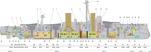 The sides of the conning tower were 11 inches thick and it had a 3-inch roof of KNC. It had a communications tube with 8 inch walls of mild steel down to the Transmitting Station on the middle deck. The walls of the signal tower were 8 inches thick while it had a roof of 3 inches of KNC armour. 2 inch torpedo bulkheads were fitted abreast the magazines and shell rooms of 'A', 'X' and 'Y' turrets, but this increased to 4 inches abreast 'P' and 'Q' turrets to compensate for their outboard location.[30]