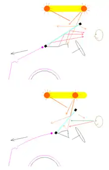 Blind spots also exist in front of boats and ships.[26] When the boat accelerates, the bow rises, increasing the size of the blind spot. Large vessels can have up to several hundreds of meters of blind spots. This is generally known as the dead visual range of a ship. To address this, cameras are sometimes placed in the front of the vessel to cover the missing field of view.