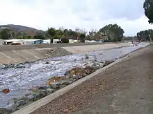 This grouted sloping boulder drop on Trabuco Creek in California is almost entirely covered by floodwater.
