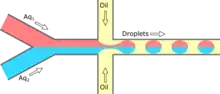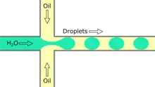 Droplet-based microfluidics manipulate discrete volumes of fluids in immiscible phases with low Reynolds number and laminar flow regimes.[1][2] Interest in droplet-based microfluidics systems has been growing substantially in past decades.[3][4] Microdroplets offer the feasibility of handling miniature volumes (μl to fl) of fluids conveniently, provide better mixing, encapsulation, sorting, sensing and are suitable for high throughput experiments.[5][1] Two immiscible phases used for the droplet based systems are referred to as the continuous phase (medium in which droplets flow) and dispersed phase (the droplet phase).[6]