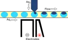 The fusion of droplets with different contents can also be exploited for reagent addition. Electro-coalescence merges pairs of droplets by applying an electric field to temporarily destabilize the droplet-droplet interface to achieve reproducible droplet fusion in surfactant-stabilized emulsions.[54][55] Electro-coalescence requires droplets (which are normally separated by the continuous phase) to come into contact. By manipulating droplet size in separate streams, differential flow of droplet sizes can bring droplets into contact before merging.[11]