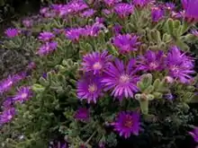 Drosanthemum floribundum, commonly known as rodondo creeper, pale dewplant, or dew-flower, is a succulent plant in the ice plant family, Aizoaceae. The species is native to the Eastern Cape in South Africa and is naturalised in Portugal and the states of South Australia, Western Australia, and Victoria in Australia,[1][2] as well as Pacific Grove, California[3] where it is called the Magic Carpet. It is a trailing perennial with hairy stems and leaves that are either cylindrical or triangular in cross section. These are between 3 and 15 mm in length and 1 to 2.5 mm in width. Flowers are up to 2.5 cm in diameter and are lavender, pink or occasionally white.[2]