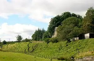 The nominal junction between the Caledonian Railway and the Glasgow and South Western Railway was at the county boundary at Loudounhill Station. The closed line was used to store hundreds of damaged railway waggons that were awaiting repair.[5]
