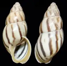 Specimen by Breure (2010)[2] corresponds to the description given by Pilsbry (1898).[2][3] He regarded this taxon as a colour form of Drymaeus strigatus, which, however, has always a lilac band on the inside, bordering the peristome.[2]