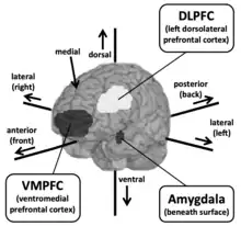 In addition, Greene's results show that some brain areas, such as the medial prefrontal cortex, the posterior cingulate/precuneus, the posterior superior temporal sulcus/inferior parietal lobe, and the amygdala, are associated with emotional processes. Subjects exhibited increased activity in these brain regions when presented with situations involving the use of personal force (e.g. the 'footbridge' case). The dorsolateral prefrontal cortex and the parietal lobe are 'cognitive' brain regions; subjects show increased activity in these two regions when presented with impersonal moral dilemmas.[6]