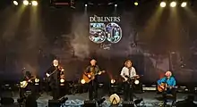 The Dubliners 50th Anniversary Tour was a tour in 2012 by The Dubliners celebrating 50 years. The group was awarded a lifetime achievement award by BBC Radio 2 in February.[1] However, in April, founding member and tenor banjo player Barney McKenna died.[2] Banjo player Gerry O'Connor filled his place until the end of the tour. In November the group released the album 50 Years charting in the Irish Top 10.[3] John Sheahan after 48 years decided he could no longer continue with the band due to the death of Barney McKenna. In December the group played its final concerts at Vicar Street and were joined on stage by Jim McCann. The band met with President Michael Higgins in the presidential palace in Dublin. The group appeared on BBC's Jools Holland Annual Hootenanny on New Year's Eve. With the exception of John Sheahan, the rest of the group continues touring as The Dublin Legends - Spirit of the Dubliners.