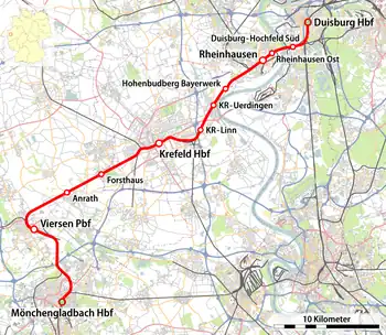 The greater part of the route, along with the western section of the Ruhr line of the Rhenish Railway Company (Rheinische Eisenbahn-Gesellschaft, RhE), forms the Duisburg–Mönchengladbach line, one of the main line in Germany’s lower Rhine region, connecting the stations of Duisburg and Mönchengladbach.