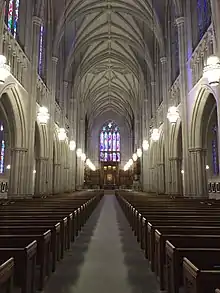 Duke University Chapel is a chapel located at the center of the campus of Duke University in Durham, North Carolina, United States. It is an ecumenical Christian chapel and the center of religion at Duke, and has connections to the United Methodist Church. Constructed from 1930 to 1932, the chapel seats about 1,800 people and stands 210 feet (64 m) tall, making it one of the tallest buildings in Durham County. It is built in the Collegiate Gothic style, characterized by its large stones, pointed arches, and ribbed vaults.[1] It has a 50-bell carillon and three pipe organs, one with 5,033 pipes and another with 6,900 pipes.[2]