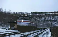 The Great Western Railway (GWR) put their line through Dundas in 1853, but it wasn't until 1864 that the first station was built.[3] They algamated with the Grand Trunk Railway (GTR) in 1882,[4] who constructed a new station building in 1904 and double tracked the line.[3] The GTR was absorbed by the Canadian National Railway (CNR) in 1923. Via Rail continued to provide passenger train service to the station from 1977 until the mid 1980s. A fire seriously damaged the station in 1984 and it was decided to move the historic structure to a more suitable site. The building collapsed while it was being dismantled and it could not be saved.[3] The VIA/Amtrak International continued to stop until it was rerouted in 1990. A restricted fire access route from Highway 8 is the only reminder of a railway station in the area.