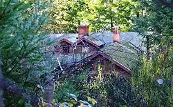 Located in the foothills of the Northern Oregon Coast Range, the farm is on Dundee Road northwest of the city of Gaston near Henry Hagg Lake in the western part of the county. All three of the buildings on the farm were designed by E. E. Green in a rustic style.[2][9] The 1+12-story structures were all built around 1921 and featuring primarily round logs for the exterior.[2][9] The buildings also used brick on the exterior.[2] This creates a log cabin look for the symmetrical U shaped main building.[10] The interior leaves the round logs exposed,[11] with some wood paneling and a brick fireplace.[12]
