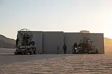 DNEG contributed to over 28 scenes in the film, and created 1,200 VFX shots out of the 1,700 total, with vendors including Wylie Co. and Rodeo FX.[108][109] Many shots used various chroma key process. Visual effects supervisor Paul Lambert used "sandscreens" for filming scenes in Arrakis and Arrakeen; instead of using green-based backgrounds, the visual effects team used sand-colored ones that matched the establishing desert shots intended for backgrounds. The sandscreens were used in capturing scenes of the ornithopter. The VFX team used the helicopter footage and later replaced them with the actual ornithopter models. This made the sand displacement, such as when it lands and takes off, easier to capture. Sand displacement via the ornithopters' movements were also filmed by encapsulating the ornithopter models in a black box with fans blowing dust around. The wings were also added in post using computer-generated imagery (CGI).[100][82][107] Similar processes were used to film scenes in Caladan, as "grayscreens," in addition to those with a "slight blue tint", were used for filming interior and exterior scenes, respectively. Bluescreens were used for Salusa Secundus scenes. He further went on to explain that different colored screens were used depending on the imagery of the foreground and background, which made compositing them together easier. The resulting shots also appeared more natural than with other chroma keys.[93][82][110] Approximately 18 tons of sand and dust were used on set, and the team created the effect of the sand blowing by attaching a V8 engine with a fan on the back of a tractor.[111]