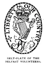 Belt-plate of the Belfast Volunteers, featuring the British crown above a harp and the initials "B V" meaning "Belfast Volunteers"