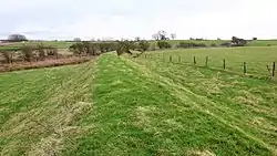 In 1848 the Scottish Journal records that a number of years ago the foundation of a ruin of considerable extent was removed by the late proprietor.[19] In 1853 Mr Dobie recorded that There can still be traced the meiths (boundary line) of a building of considerable extent on the top of the Hill of Borland.[20] In 1856 Mr G. Howie of Dunlop stated that he remembered seeing a small portion of what was said to be one of the walls about 70 or 80 years ago. It was a sort of bank, quite crumbled down and overgrown with grass. Since then the ruins of a building of considerable extent have been removed and the ground cultivated.[21] On the southern side of the hill there are the remains of a wide ditch or fosse, locally known as the 'Cuckoo slide’.[22] Paterson[23] in 1866 states that the foundation of a ruin was removed some years ago by a late proprietor.