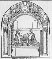 John or Hans Hamilton (1535/6–1608), son of Archibald Hamilton of Raploch,[31] was the first Protestant vicar and exhorter of Dunlop Church. One of his sons, James Hamilton, was created Viscount Claneboye for his many services to James VI in establishing and maintaining Protestantism in Ireland; his son James was in turn created Earl Clanbrassil by Charles I. His five brothers also established estates in Ireland. A handsome mausoleum (NS 40486 49398) was constructed over their graves by James in 1641, when he was in his eighties, and this was so ornately painted and gilded in the Roman Catholic manner that it attracted the sobriquet of 'The Picture House'.[38] The flat tombstone of Hans Hamilton was originally on the floor, but was later removed and placed on the south wall.[39] It was neglected and vandalised even in 1699, and in 1734 was given much needed repairs. Around 1849 Colonel Mure of Caldwell had further repairs carried out.[40][41] The marble statues of Hans and his wife have been restored and the mausoleum provided with lighting.