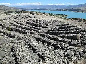 Large-scale landslides are a common feature in the Cromwell Gorge and represent a significant geological hazard following the impoundment of the Clutha River behind the Clyde Dam. Seventeen large schist landslides have been mapped along the 18 km (11 mi) length of the gorge.[11][12] These landslides underwent extensive geo-engineering in the early 1990s to mitigate their movement,[12][13] and all now have extremely low movement rates as a result.[12][14] Engineering works included extensive drainage to draw down the groundwater level, toe buttresses and in the case of the Cairnmuir Landslide, a drainage blanket. Thirteen large-diameter tunnels extend into the toes of several landslides in order to drain groundwater which otherwise lubricates the basal shear zone. Combined with smaller drainage tunnels (49 in total),[15] the total extent of the tunnels is 18.5 km (11.5 mi).[16]