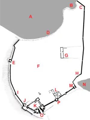 - ↑ There are historical references in 1543 to a former wall running along the north side of the castle, but it was already being described as having been eroded by the sea many years before, and the assertion that it originally existed may not be authoritative. It is also uncertain whether this statement referred to a defensive curtain wall, of which no trace remains, or a simpler wall to protect livestock. Some erosion of the cliffs has occurred since the castle was first built, but little has occurred since 1861 and it is far from certain that sufficient erosion would have taken place to have destroyed any original walls.[102]