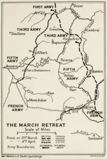 The Dury, Compiègne and Abbeville meetings were held by the Allies during World War I to address Operation Michael, a massive German assault on the Western Front on 21 March 1918 which marked the beginning of the Kaiser's Spring Offensive. Since the fall of 1917, a stalemate had existed on the Western Front. However, German victory against Russia in 1917, due to the Russian Revolution and the signing of the Treaty of Brest-Litovsk, freed up German armies on the Eastern Front for use in the west. During the winter of 1917-1918, approximately 50 German divisions in Russia were secretly transported by train to France for use in a massive, final attack to end the war.[1][2] The battle that followed, Operation Michael, totally surprised the Allies and nearly routed the French and English armies from the field.[3] The meetings below were held under these dire circumstances.