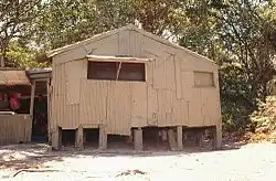 On the northern side of the original section is an annexe. This is at a lower level than the original section and has a skillion roof. The construction technique is similar to that of the original section, with an unlined timber frame externally clad in corrugated iron. However, the frame is constructed of machined timber members and the corrugated iron is in sheets rather than small pieces. Large openings, of similar design to the window in the original section, are located in each side of the annexe and doors are located in the western and northern sides. At the front of this area is a sink and benchtop, and the remainder of the space is divided by a minimal amount of furniture.[1]