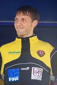 The club turned to Ruud Kaiser, a Dutchman with a good reputation at youth level, as Geyer's replacement.[57] They played in the first ever match of the third Liga, beating Rot-Weiß Erfurt 1–0 with a goal from Halil Savran,[57] but results were not consistent, and they could only finish in mid-table.[57] The 2009–10 season began badly, and Dynamo were in relegation trouble, so Kaiser was sacked and replaced by Matthias Maucksch, a former player who had had some success with the reserve team.[57] Maucksch managed to drag the team safely from relegation, and finished the season in 12th place. Maucksch led the team to contention for a playoff place during the 2010–11 season, but was sacked in April after a run of five games without a win, and was replaced by Ralf Loose.[58] Loose ended the season unbeaten and secured third place, and a playoff against VfL Osnabrück which Dynamo won 4–2 on aggregate to earn promotion to the 2. Bundesliga.[59]